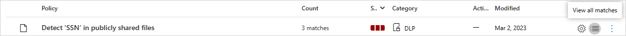 13. ファイル ポリシーの一致を表示するには、[ポリシー] ->[ポリシー管理] に移動します。 ここでは、ポリシーに違反していると疑われるファイルを確認できます。 結果をフィルター処理して、上部の [種類 ] フィルターを使用してファイル ポリシーのみを表示します。 各ポリシーの一致の詳細については、[ カウント ] 列で、ポリシーの 一致 の数を選択します。 または、ポリシーの行の末尾にある 3 つのドットを選択し、[ すべての一致を表示] を選択します。 ファイル ポリシー レポートが開きます。 [ 今すぐ照合 ] タブを選択すると、現在ポリシーに一致するファイルが表示されます。 [ 履歴 ] タブを選択すると、ポリシーに一致した最大 6 か月間のファイルの履歴が表示されます。