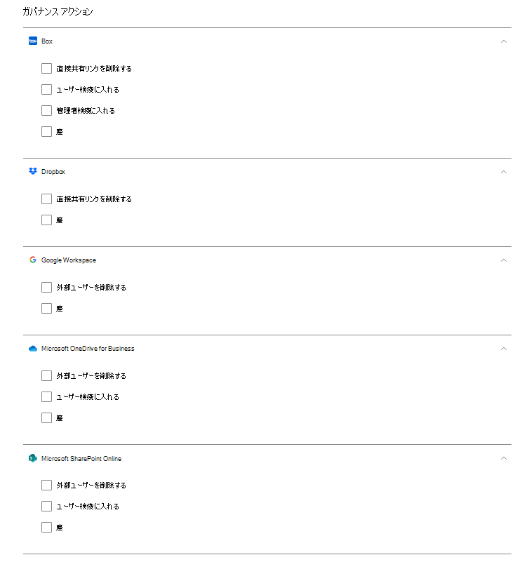 ファイル、ファイル ポリシー | File | 外部ユーザーを削除する | [設定] で内部として構成されているドメインの外部にあるすべての外部コラボレーターを削除します。 | Google ワークスペース、Box、One Drive、SharePoint |