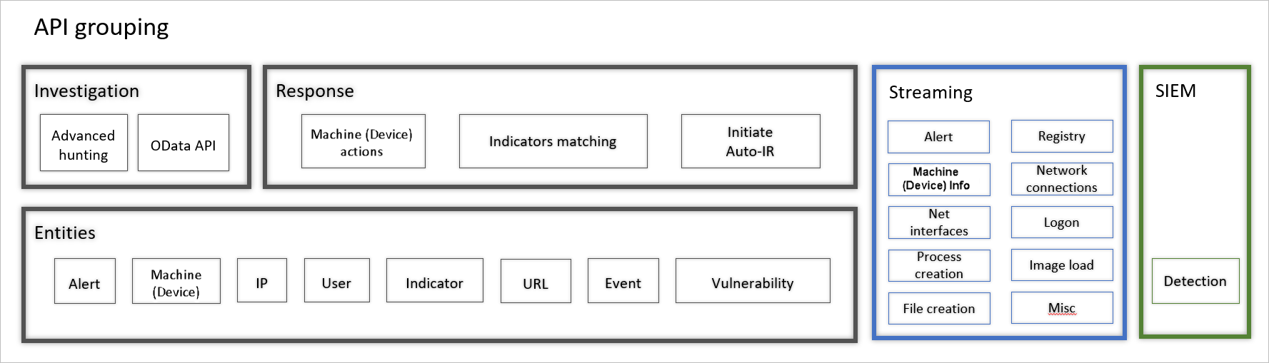 Defender for Endpoint API は、次の 3 つにグループ化できます。