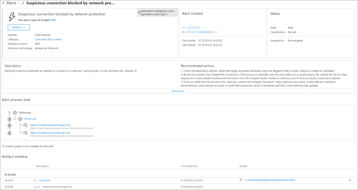 - ネットワーク保護によってブロックされた疑わしい接続: このアラートは、ネットワーク保護 (ブロック モード) が、カスタム インジケーター リスト内の悪意のある Web サイトまたは Web サイトへのアクセスを停止したときに生成されます。