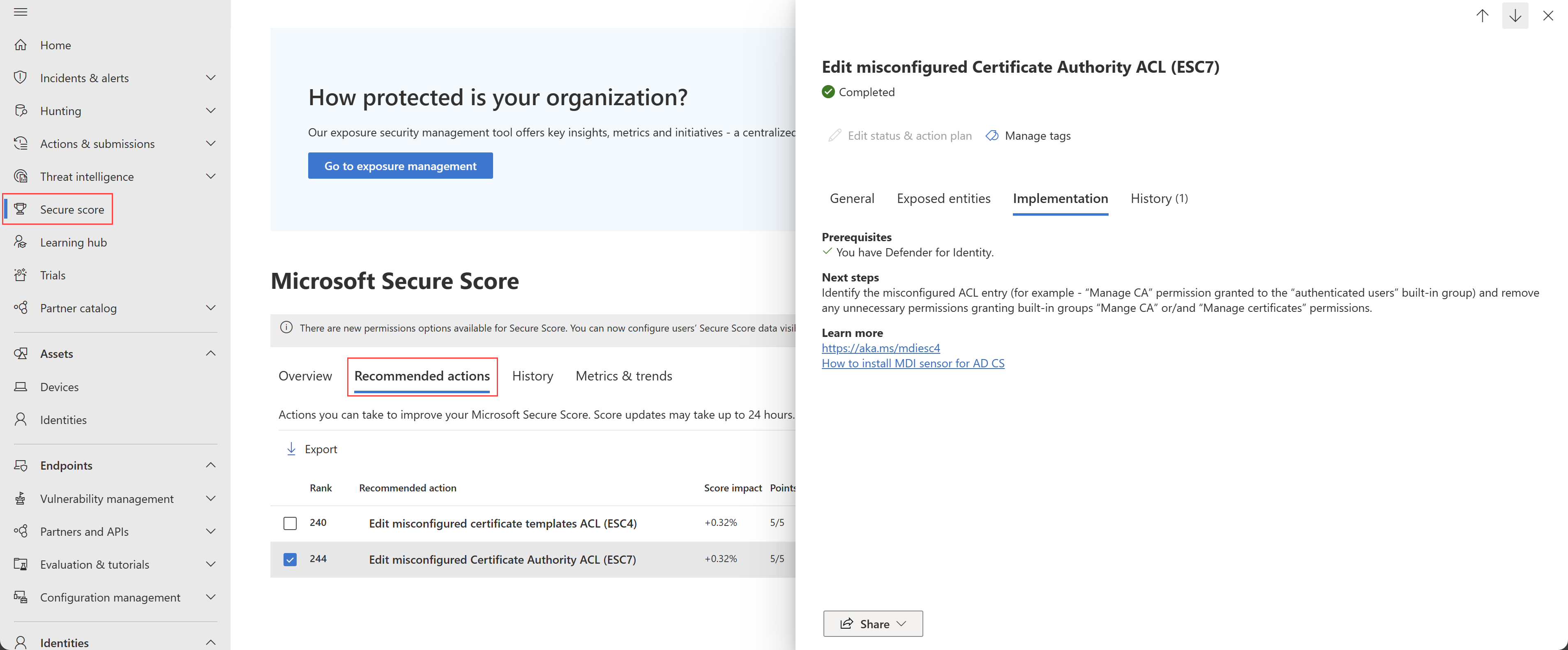 正しく構成されていない証明機関 ACL については、 https://security.microsoft.com/securescore?viewid=actions で推奨されるアクションを確認してください。 以下に例を示します。