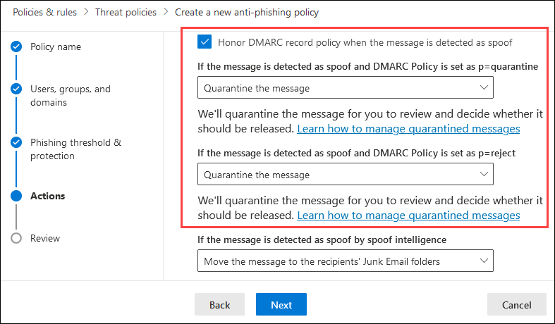 [ メッセージをアクションとして検疫する ] を選択すると、スプーフィング インテリジェンス保護のために選択された検疫ポリシーが使用されます。