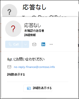 認証されていない送信者のスプーフィングの表示 (?): メッセージが SPF または DKIM チェックに 合格せず、メッセージが DMARC または 複合認証に合格しない場合は、[差出人] ボックスの送信者の写真に疑問符を追加します。 この設定をオフにすると、送信者の写真に疑問符は追加されません。