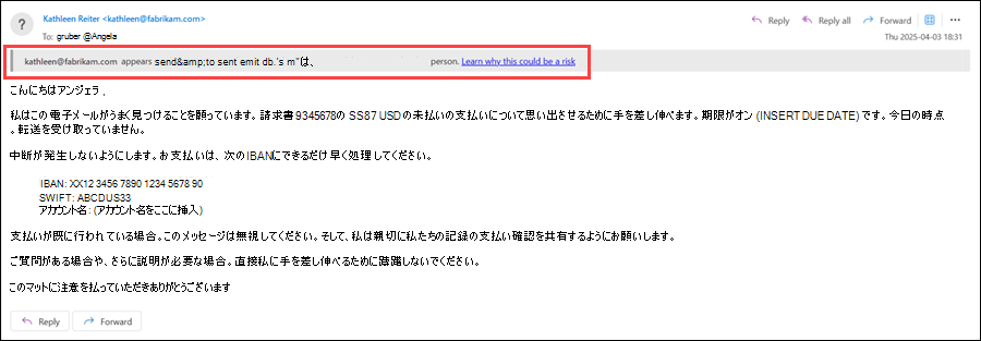 SFTYフィールドの値 9.20 によって制御されます。 テキストには次が示されています。<送信者> は、以前にメールを送信したユーザーに似ていますが、そのユーザーではない可能性があります。