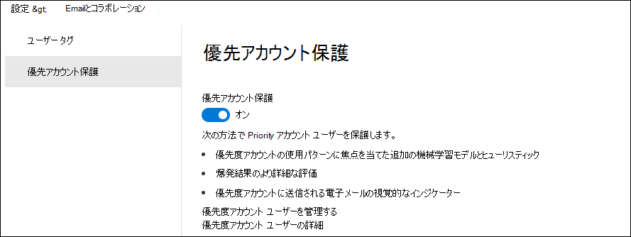 優先度アカウント保護は、通常のユーザーにはメリットのない会社のエグゼクティブに合わせて調整された追加のヒューリスティックを提供します。 優先アカウント保護は、Microsoft データセンターからの広範なデータに基づく会社の役員のメール フロー パターンに適しています。