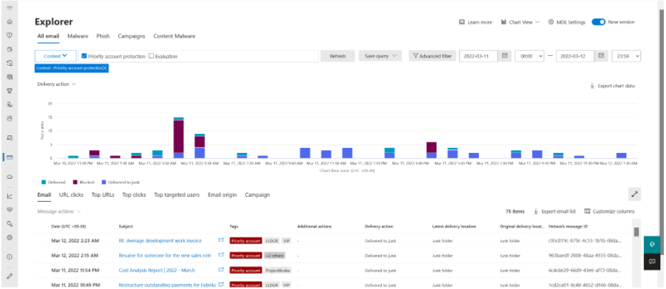 [エクスプローラー] ページの [すべてのメール]、[マルウェア]、または [フィッシング] タブで、[Context>Equal any>Priority アカウント保護] を選択し、[最新の情報に更新] を選択します。