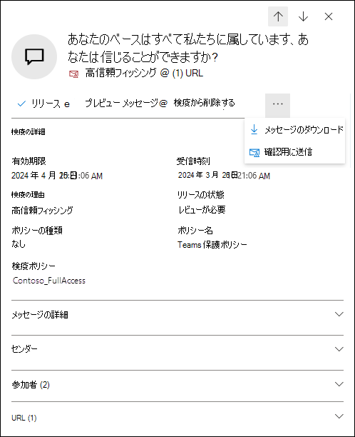 詳細ポップアップの次のセクションは、検疫された Teams メッセージに関連しています。