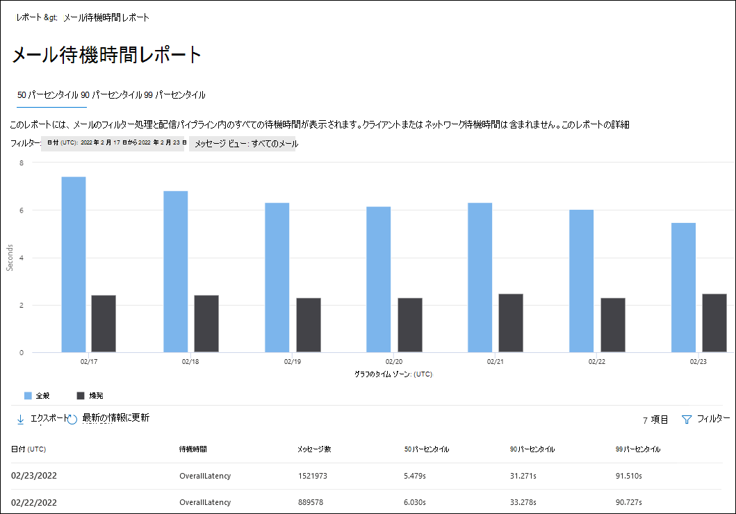 [メール待機時間] レポートには、Defender for Office 365 organization内で発生したメール配信と爆発の待機時間の集計ビューが表示されます。 多くの要因がサービスのメール配信時間に影響し、絶対配信時間 (秒単位) は成功や問題を示す適切な指標ではないことがよくあります。 1 日の配送時間が遅い場合は、別の日の平均配送時間と見なされる場合もあれば、その逆の場合もあります。 このレポートは、他のメッセージの観察された配信時間に関する統計データに基づいてメッセージ配信を修飾しようとします。