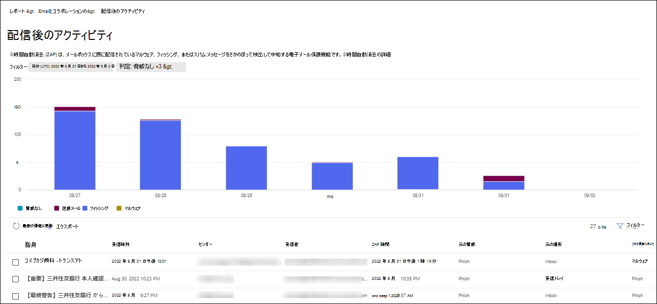 - フィッシング: フィッシングのために ZAP によってメールボックスから削除された一意のメッセージの数。