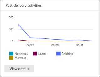 https://security.microsoft.com/emailandcollabreportの [Email & コラボレーション レポート] ページで、[配信後のアクティビティ] を見つけて、[詳細の表示] を選択します。 または、レポートに直接移動するには、 https://security.microsoft.com/reports/PostDeliveryActivitiesを使用します。