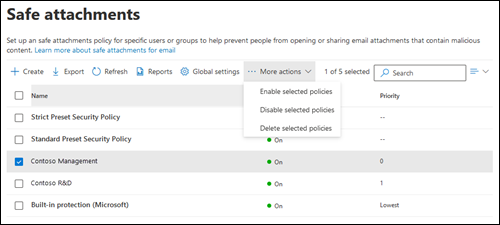 Microsoft Defender ポータルを使用して、安全な添付ファイル ポリシーに対するアクションを実行する