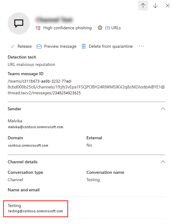 Teams チャネル保護の例外に使用する受信者のメール アドレスを取得するには、Teams メッセージ エンティティ パネルの [チャネルの詳細] セクションにある [名前] と [電子メール] の値を使用します。 詳細については、「Microsoft Defender for Office 365の Teams メッセージ エンティティ パネル」を参照してください。