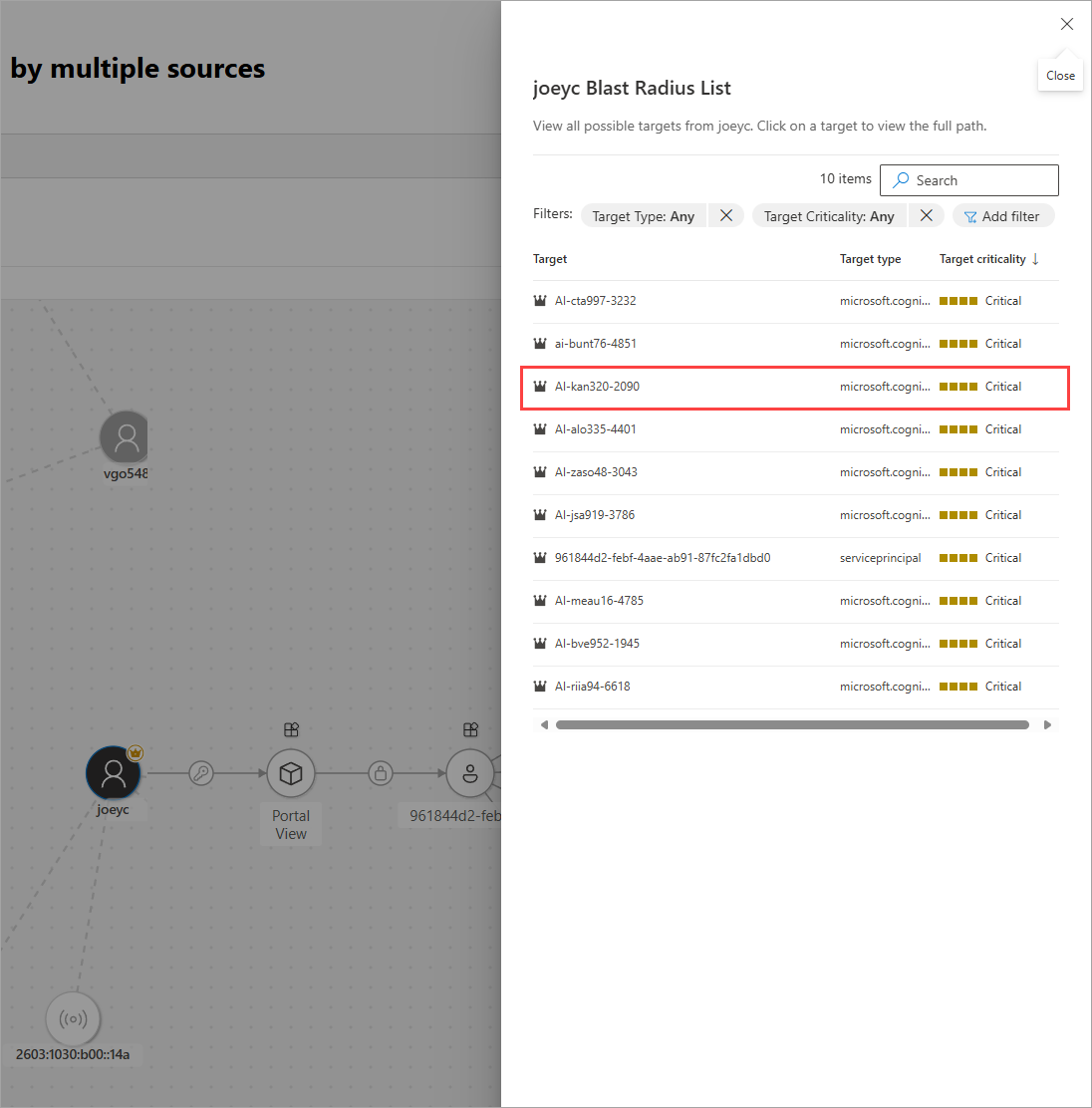 [ ブラスト半径の一覧を表示 ] を選択すると、ターゲット アセットの一覧が表示されます。 一覧からターゲット 資産を選択して、その詳細と潜在的な攻撃パスを表示します。 接続でバッジを選択すると、接続の詳細が表示されます。