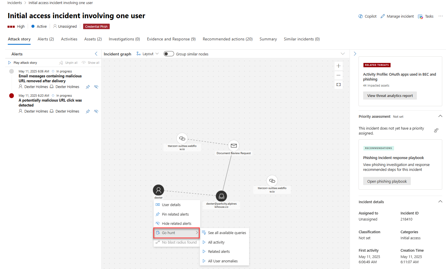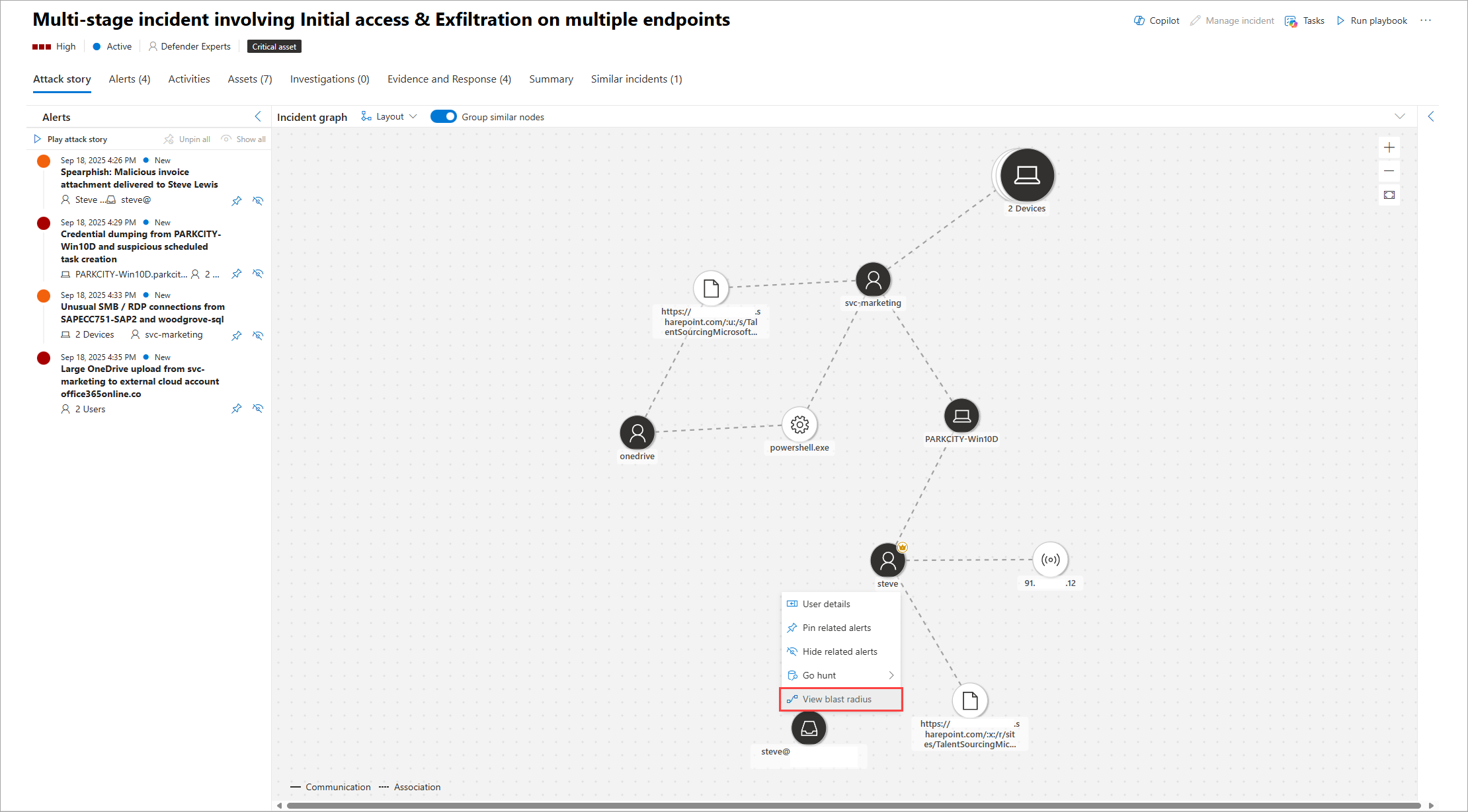 調査グラフは、攻撃の一部であるさまざまな疑わしいエンティティを、ユーザー、デバイス、メールボックスなどの関連資産と接続することで、攻撃の完全な範囲をすばやく理解するのに役立ちます。