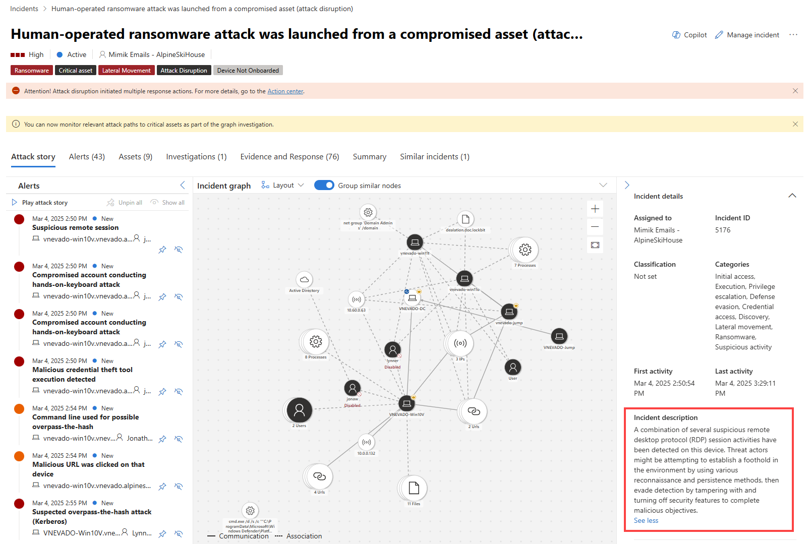 Microsoft Defender ポータルでは、すべての資産からインシデントに関連するアラート、資産、調査、証拠が表示され、攻撃の幅全体を包括的に確認できます。