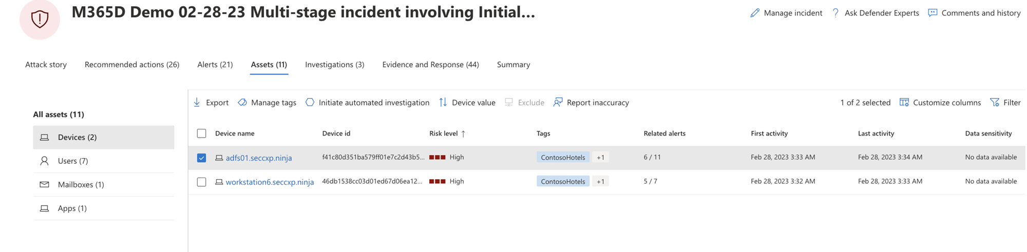 [ デバイス] ビューには、インシデントに関連するすべてのデバイスが一覧表示されます。 次に例を示します。