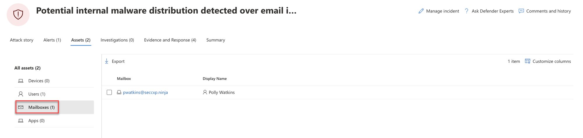 [メールボックス] ビューには、インシデントの一部またはインシデントに関連していると特定されたすべてのメールボックスが一覧表示されます。 次に例を示します。