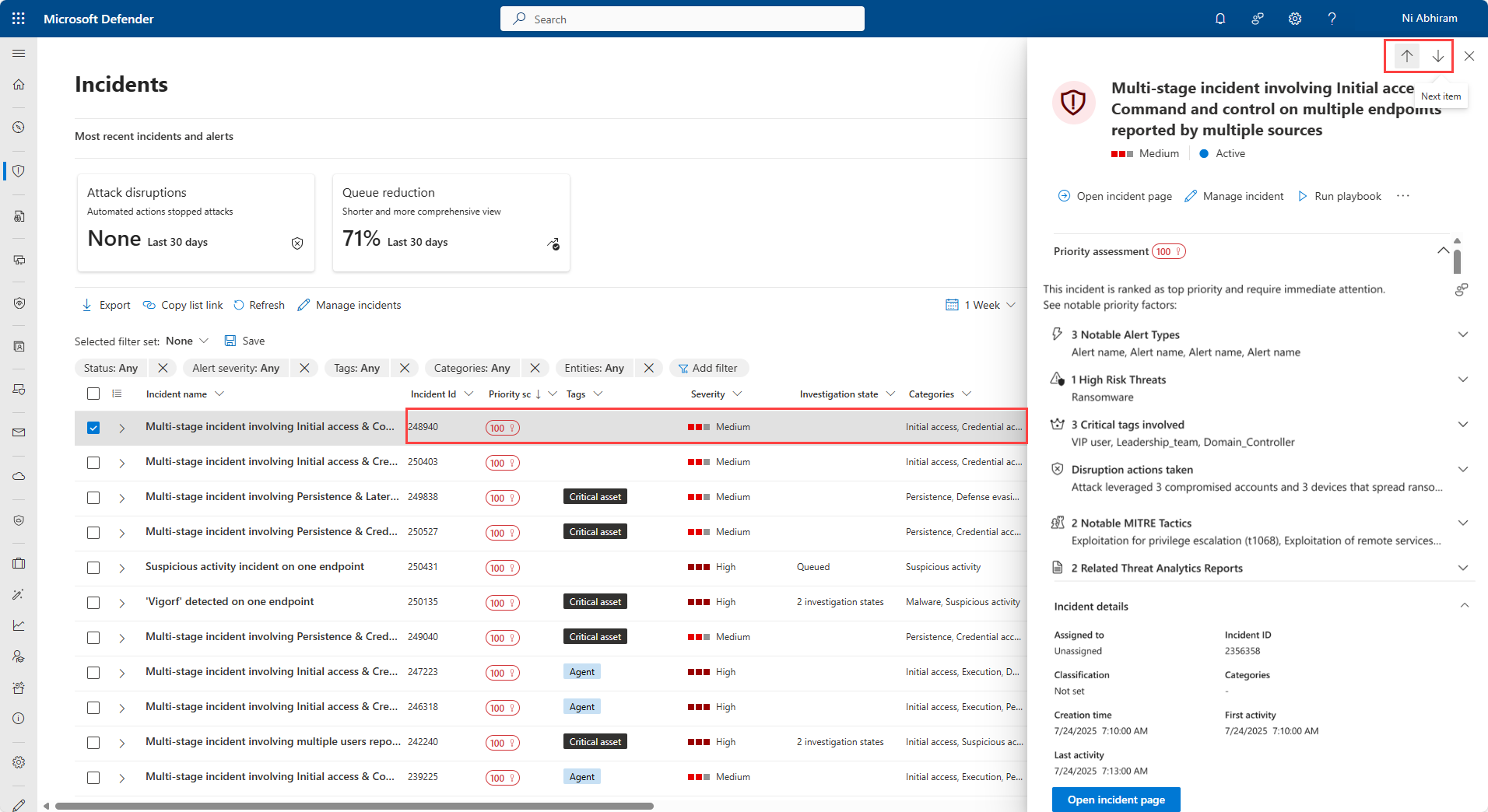 まず、インシデント行を選択しますが、インシデント名は選択しません。 優先度評価、優先度スコアに影響する要因、インシデントの詳細、推奨されるアクション、関連する脅威など、インシデントに関する重要な情報が表示された概要ウィンドウが開きます。 ペインの上部にある上矢印と下矢印を使用して、インシデント キュー内の前または次のインシデントに移動します。