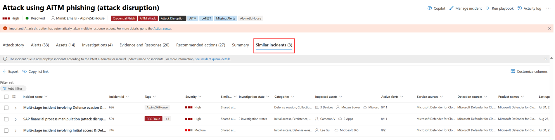 インシデントによっては、[類似インシデント] ページに類似した インシデントが 表示される場合があります。 このセクションでは、同様のアラート、エンティティ、およびその他のプロパティを持つインシデントを示します。 これは、攻撃の範囲を理解し、関連する可能性がある他のインシデントを特定するのに役立ちます。 次に例を示します。
