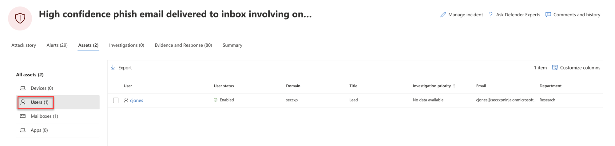 [ ユーザー ] ビューには、インシデントの一部またはインシデントに関連していると特定されたすべてのユーザーが一覧表示されます。 次に例を示します。