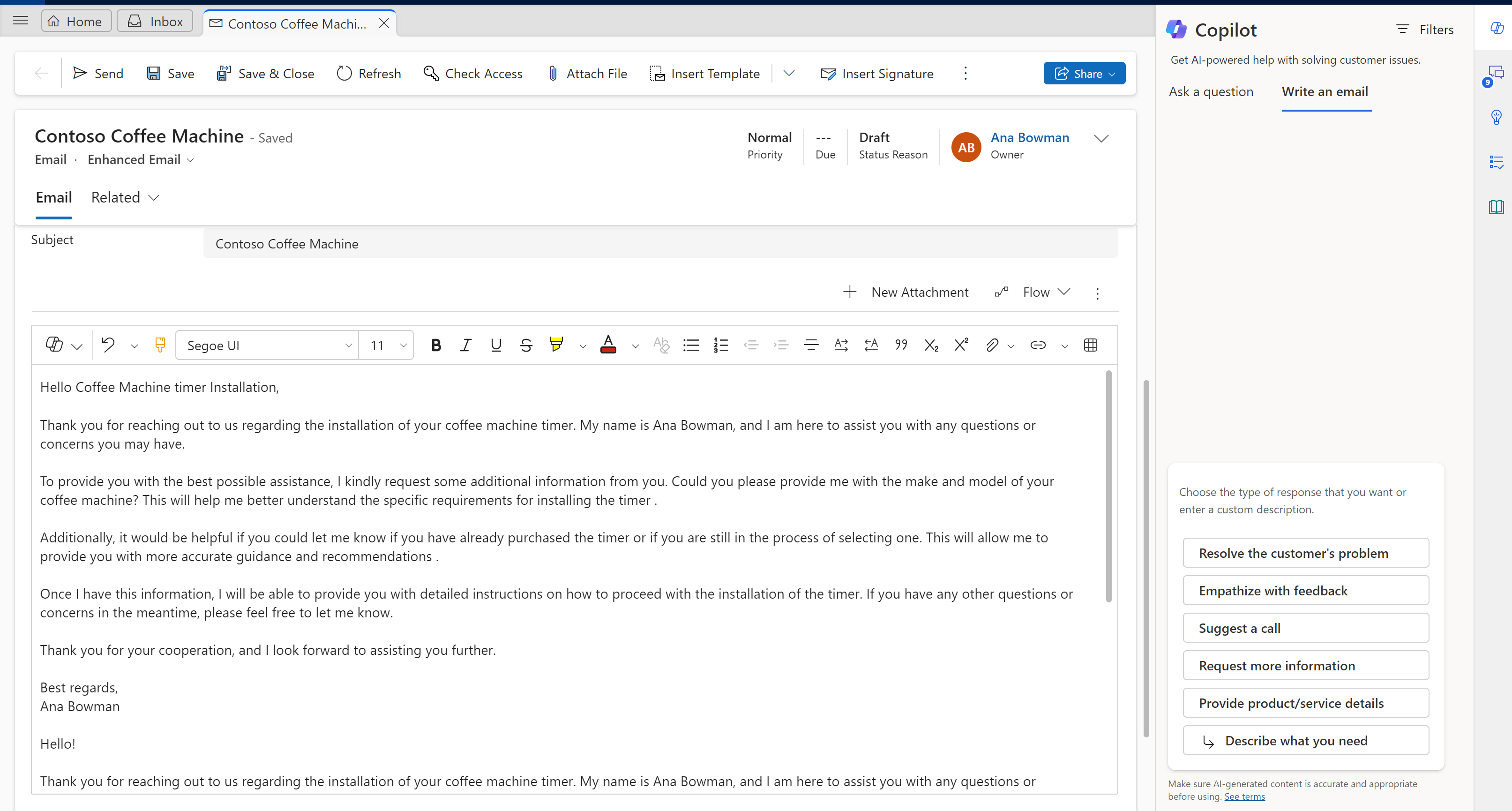 顧客にメールを送信する前に、Copilot が生成する応答を常に確認してください。