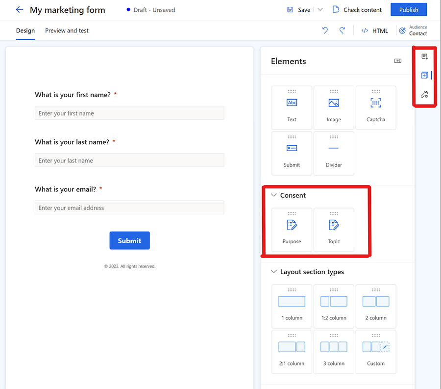 要素セクションからフォームに同意の制御を追加できます。 フォームに同意の制御を追加すると、プロパティで正しい同意目的を選択できます。 同意チェックボックスのキャプションを選択して、テキストを変更します。 Customer Insights - Journeys で電子メールとテキスト メッセージの同意を管理する方法について説明します。