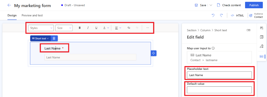 キャンバス上で選択してフィールド ラベルを編集できます。 リッチ テキスト エディターでキャンバスに表示したテキストのスタイルを編集します。 右側のペインでプレースホルダー テキストと既定値を変更します。 フィールドの既定値を変更する際は、キャンバスのフィールドにテキストを入力します。