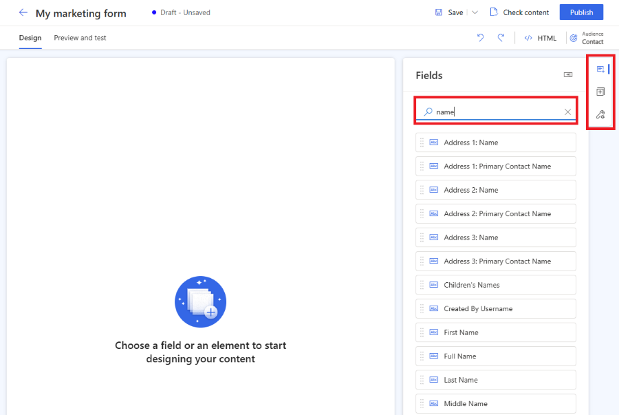 これで、フォーム フィールド で表される質問のリストが作成されました。 使用可能なフィールドのリストは右側のウィンドウにあり、選択した対象ユーザー (エンティティ) のすべての属性が含まれています。 エンティティの新しいカスタム属性を作成すると、このリストに表示され、フォームのフィールドとしてすぐに使用できます。 一部のシステム フィールドはフォームで使用できないため、非表示になっている場合があります。 フィールド リストの検索バーを使用して、探しているフィールドをフィルター処理できます。
