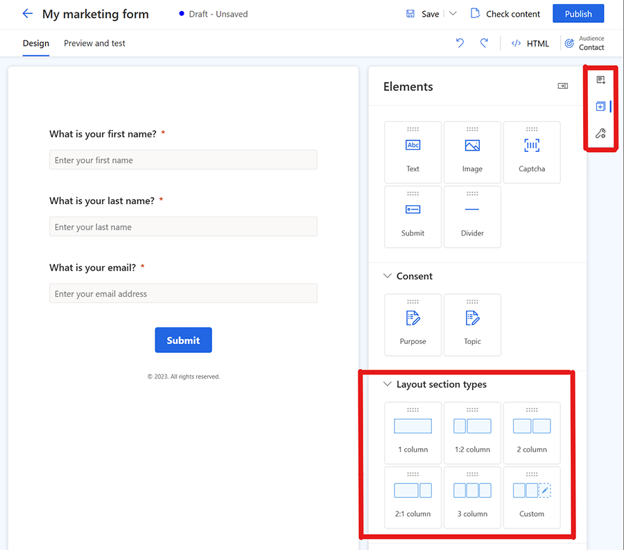 より複雑なフォームを作成したい場合は、フォームのレイアウトを複数列に変更し、複数のレイアウト セクションを作成できます。 右側のウィンドウで、要素セクションを選択します。 フォーム キャンバスに列レイアウトをドラッグ アンド ドロップして、新しいセクションを作成できるようになりました。 新しく作成されたセクションに要素とフィールドを追加できます。