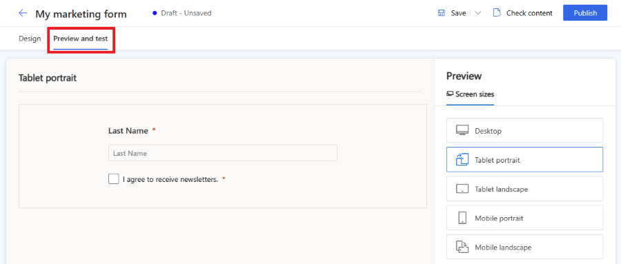 これで、フォームをプレビューして応答性を確認できます。 フォーム プレビューを開く際は プレビューとテスト タブを選択します。さまざまなプラットフォームを選択して、モバイル デバイスやタブレットでフォームがどのように表示されるかを確認できます。