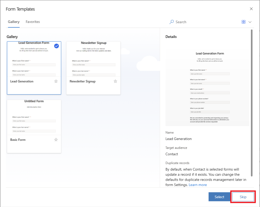 テンプレートを選択します。 テンプレートのリストは、対象ユーザーに応じてフィルター処理されます。 空白のフォームから開始する場合は、テンプレートの選択をスキップできます。 テンプレートの選択をする、またはスキップを選択すると、フォーム エディターが表示され、フォームの作成プロセスを完了まで進めることができます。