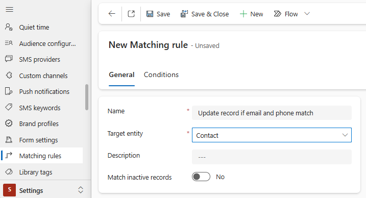 - 保存ボタンを選択します。 照合ルールが作成され、[ 条件 ] タブでアクセスします。