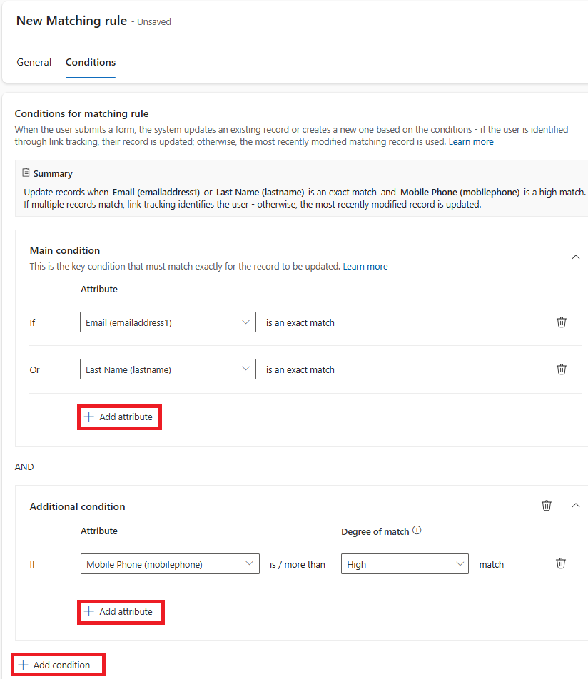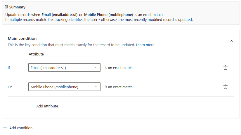 - メイン条件: メイン条件は常に最初に実行され、最も関連性の高いレコードのグループが収集されます。 主なルールはデータベースへの直接クエリであるため、一致の程度は常に 正確 です (あいまい一致を設定することはできません)。 メイン条件に複数の属性を追加できます。 条件の属性間には常に OR 演算子があります。