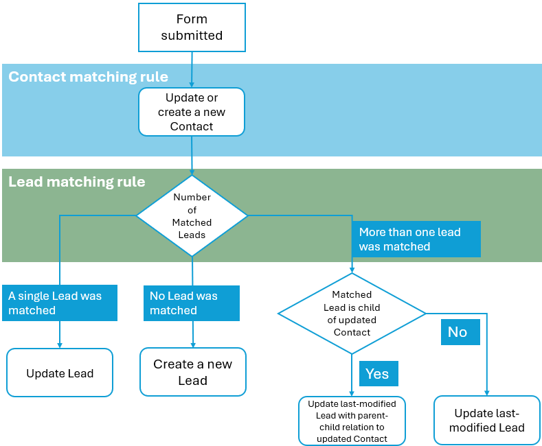 フォームの申請が対象ユーザーの "潜在顧客と連絡先" の組み合わせである場合は、連絡先と潜在顧客に個別の一致ルールが適用されます。 連絡先の照合ルールが最初に適用されます。 一致した連絡先に対して子潜在顧客が見つかった場合、既存の潜在顧客が潜在顧客照合ルールで定義されているすべての条件を満たしている場合、子潜在顧客は潜在顧客照合ルールの評価で優先されます。 リンクの追跡は、照合のプロセスでも考慮されます。