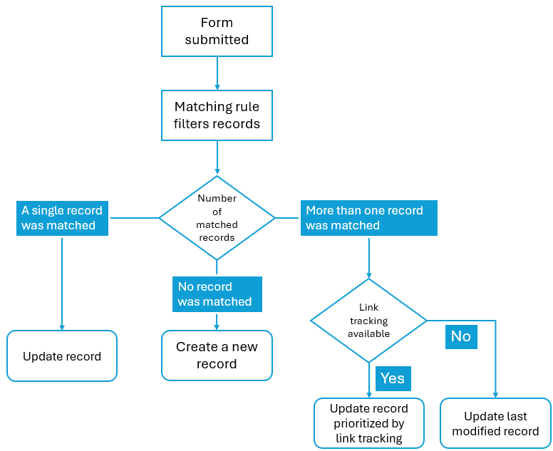 既存のユーザーがフォームを送信し、 リンク追跡によって識別され、送信された値が一致するルールと一致すると、リンク追跡によって識別された既存のレコード (連絡先または潜在顧客) が更新されます。 送信された値が一致するルールと一致しない場合、リンク追跡は使用されず、最後に変更されたレコードが更新されます。