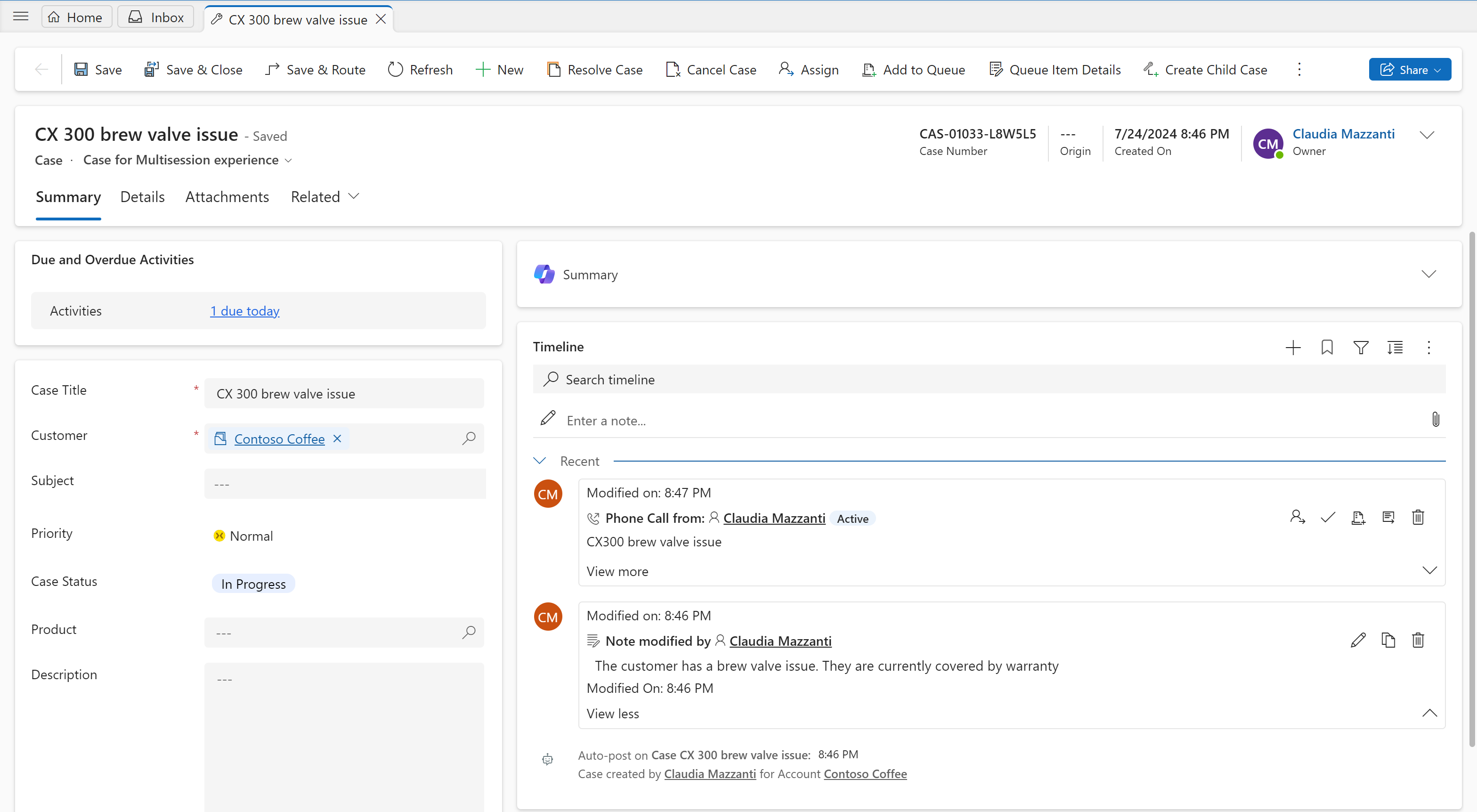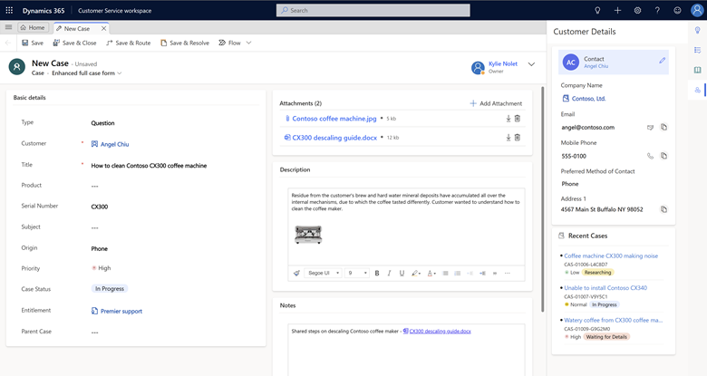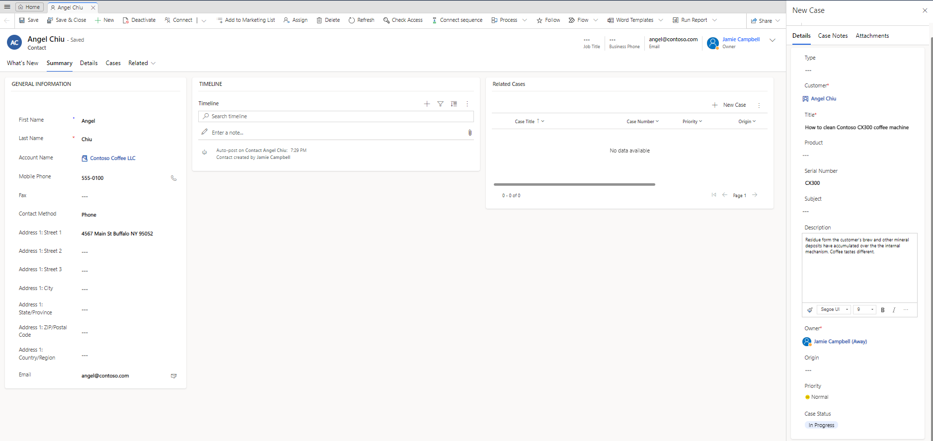 Customer Service workspace では、サポート案件が強化されています。 顧客サービス担当者 (サービス担当者または担当者) は、タブを切り替えることなく顧客の詳細を確認および編集でき、サポート案件作成フローを中断することなく既存のサポート案件を更新できます。 また、経験値の向上は、サポート案件の重複を防ぐことにも役立ちます。