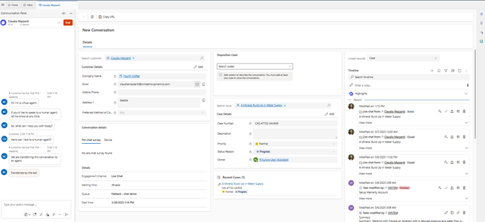 会話にリンクされているサポート案件によって設定された詳細が表示されます。 別のタブに移動することなく、インラインでサポート案件の詳細を編集することができます。ただし、既定の問題のスナップショットカードが表示される場合、管理者はアクティブな会話フォームの強化されたサポート案件詳細エクスペリエンスを無効にしています。