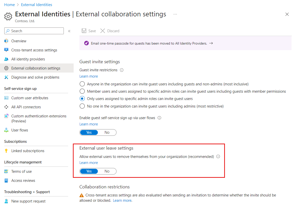 管理者は、[外部ユーザーの脱退設定] を使用して、外部ユーザーが組織から自分を削除できるかどうかを制御できます。 外部ユーザーが自分を組織から削除できないようにした場合、外部ユーザーは管理者またはプライバシー連絡先に連絡して削除してもらう必要があります。