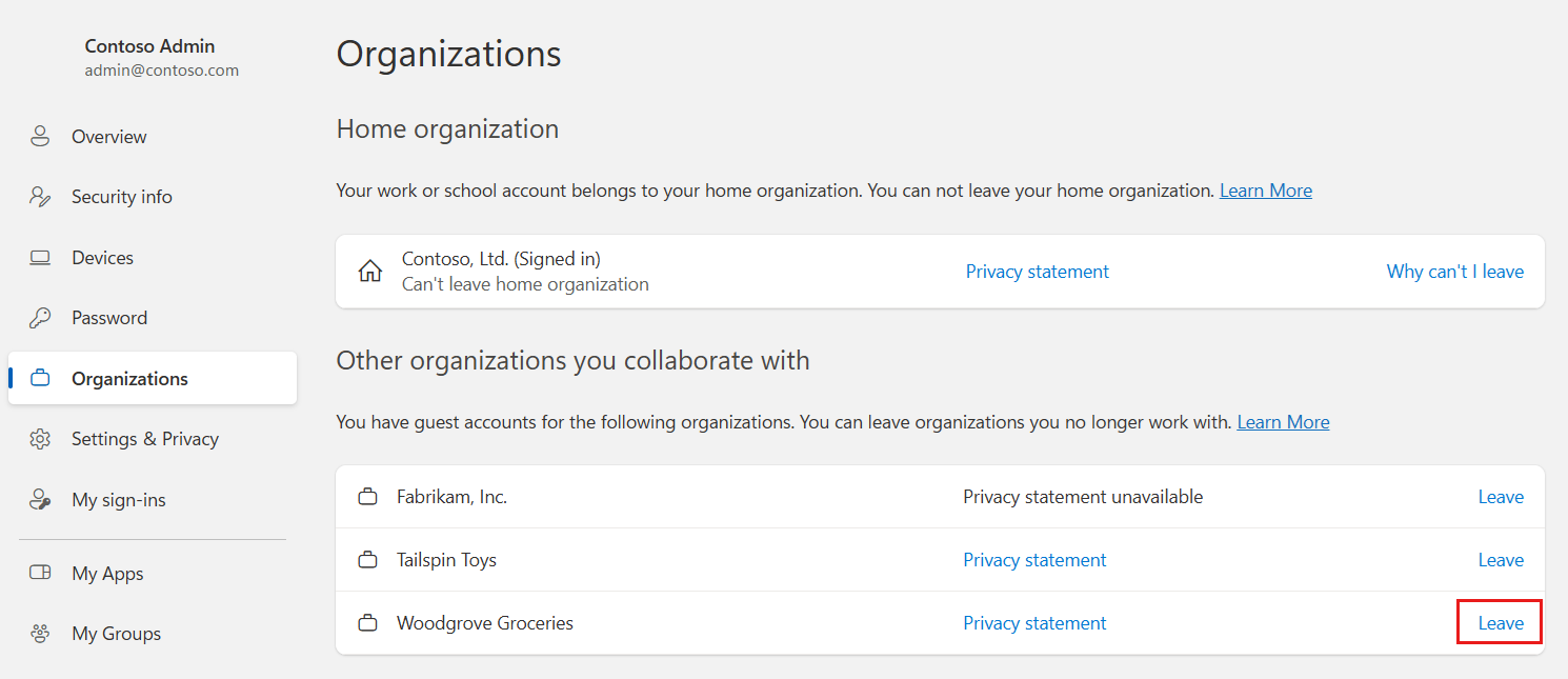 通常、管理者に連絡することなく独自の判断で組織を脱退することができます。 ただし、場合によっては、このオプションを使用できないため、外部組織のアカウントを削除できるテナント管理者に問い合わせる必要があります。