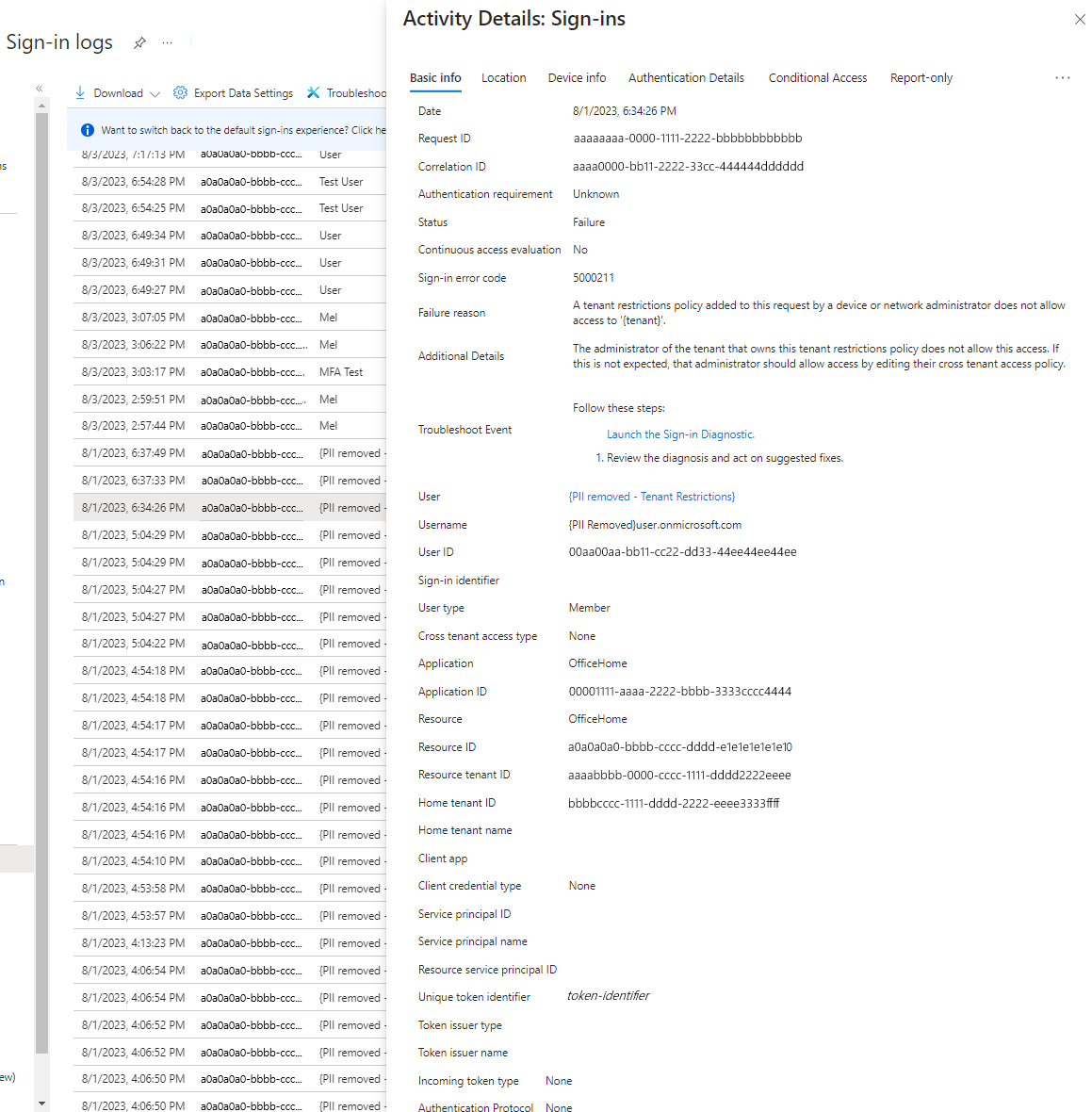 Microsoft Entra サインイン ログを使用すると、テナント制限 v2 ポリシーが適用されたサインインに関する詳細を表示できます。 B2B ユーザーがリソース テナントにサインインして共同作業を行うと、ホーム テナントとリソース テナントの両方にサインイン ログが生成されます。 これらのログには、使用されているアプリケーション、メール アドレス、テナント名、ホーム テナントとリソース テナントの両方のテナント ID などの情報が含まれます。 次の例は、正常なサインインを示しています。