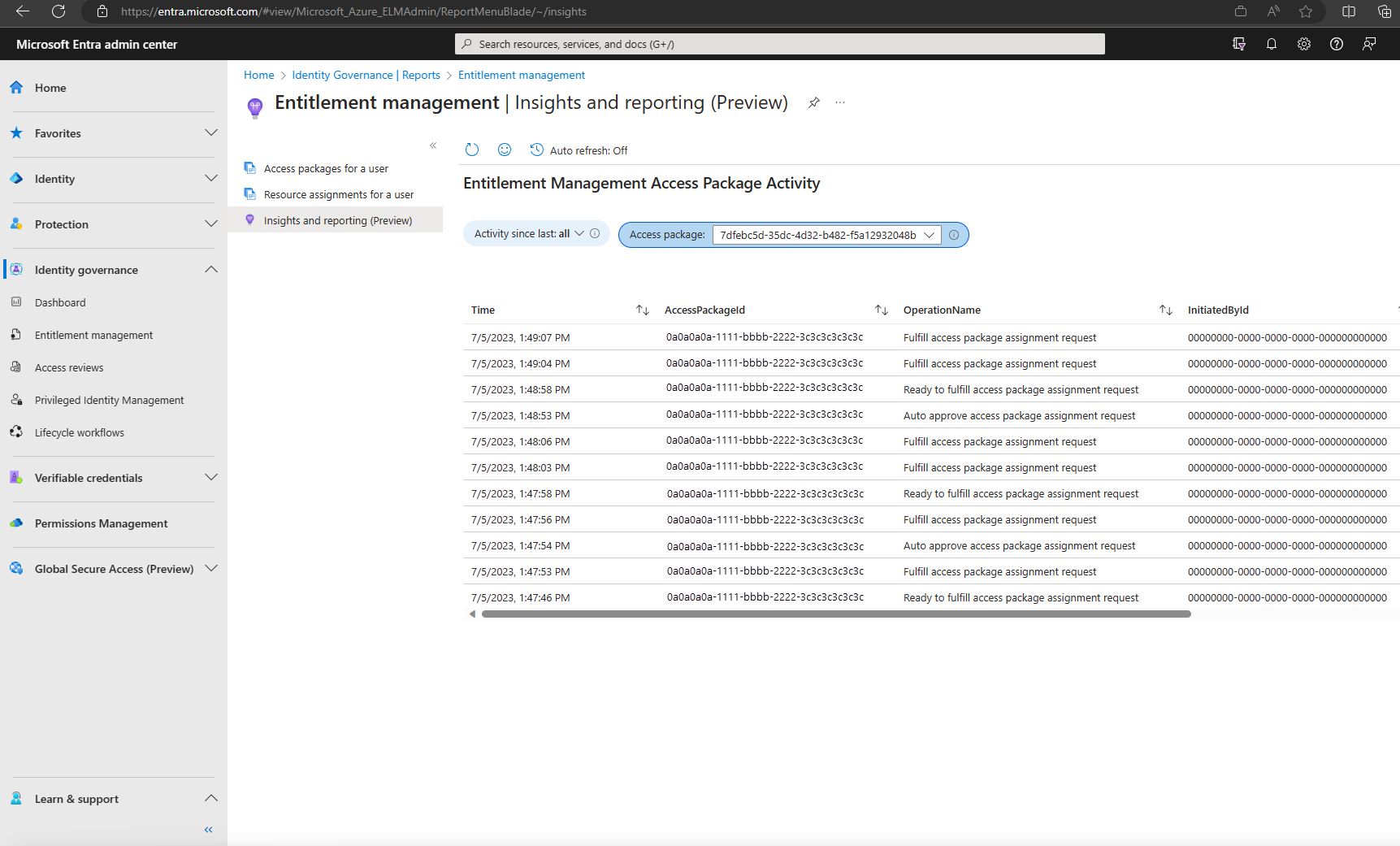 アクセスするパッケージへのアクセス権を、どのようにユーザーが要求し受け取ったかの追加の詳細については、Microsoft Entra 監査ログを使い確認できます。 具体的には、EntitlementManagement