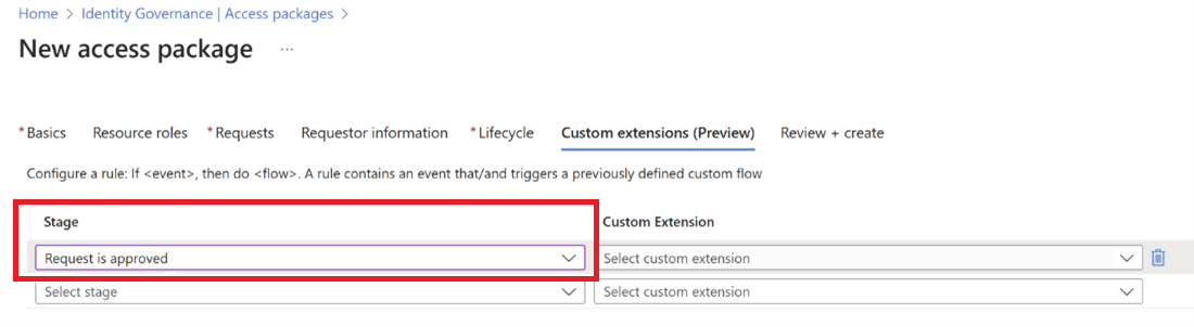 ステージの下のメニューで、このカスタム拡張機能 (ロジック アプリ) のトリガーとして使用するアクセス パッケージ イベントを選択します。 このシナリオでは、アクセス パッケージが承認されたときにカスタム拡張機能ロジック アプリ ワークフローをトリガーするには、[ 要求が承認されました] を選択します。
