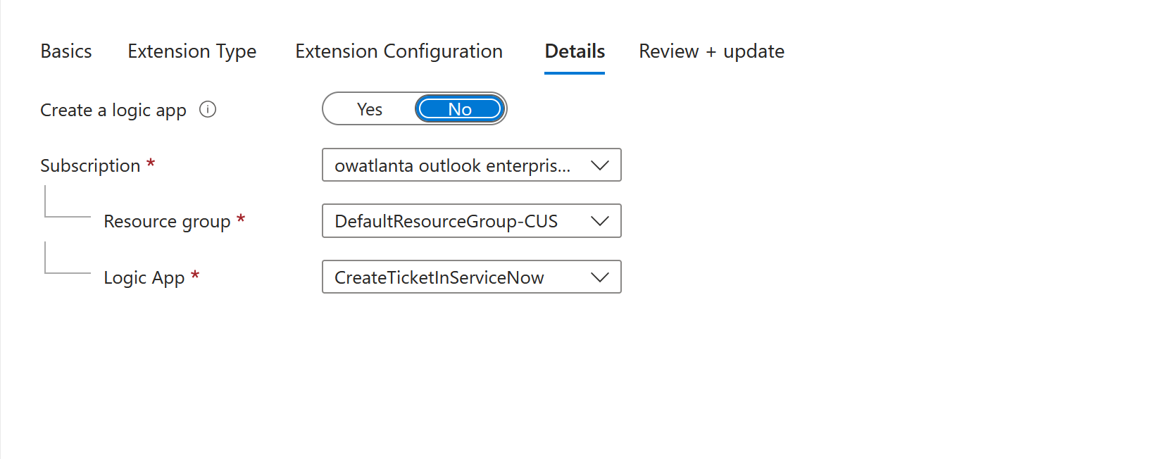 前の手順でロジック アプリが既に作成されているため、[ 詳細 ] タブの [新しいロジック アプリの作成] フィールドで [いいえ] を選択します。 ただし、ロジック アプリ名と共に、Azure サブスクリプションとリソース グループの詳細を指定する必要があります。