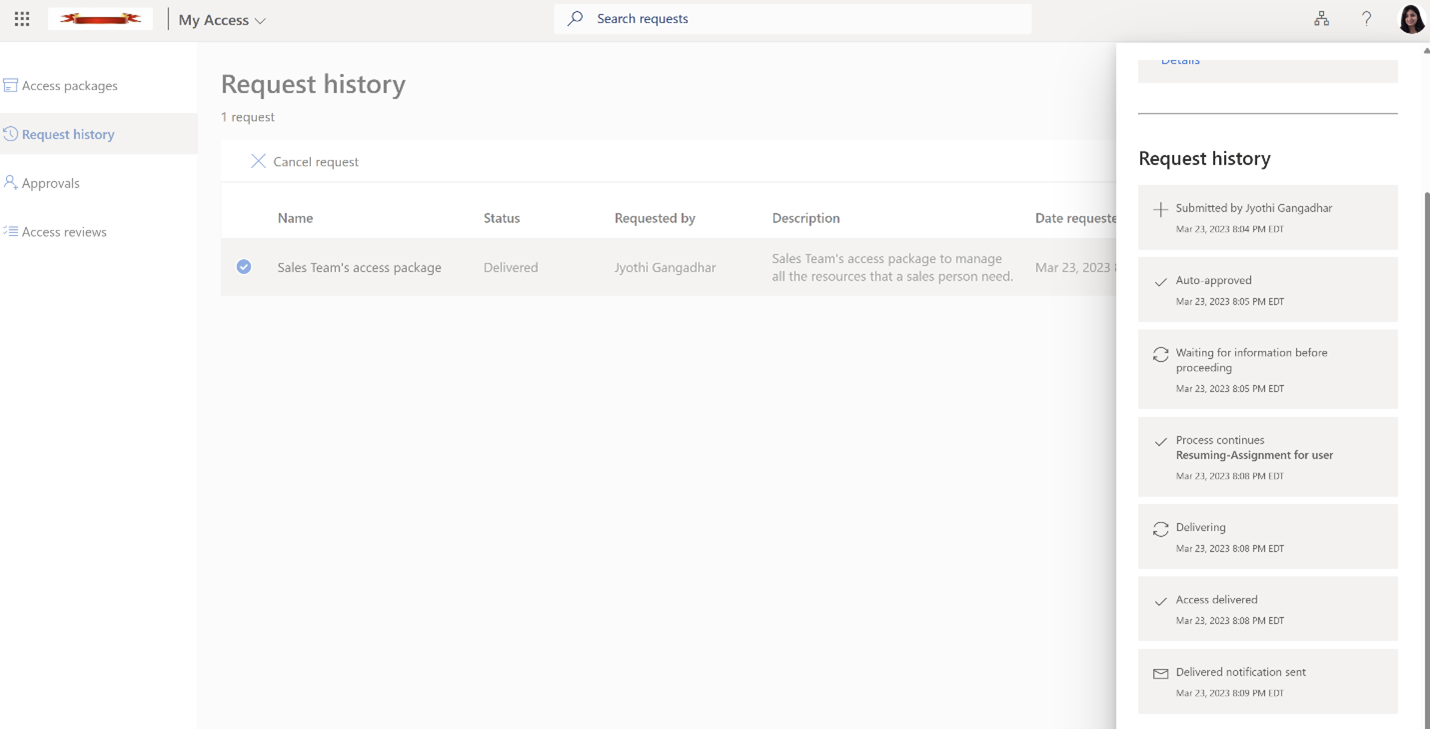 - 要求されたアクセス パッケージへのアクセスをエンド ユーザーとして受け取る。