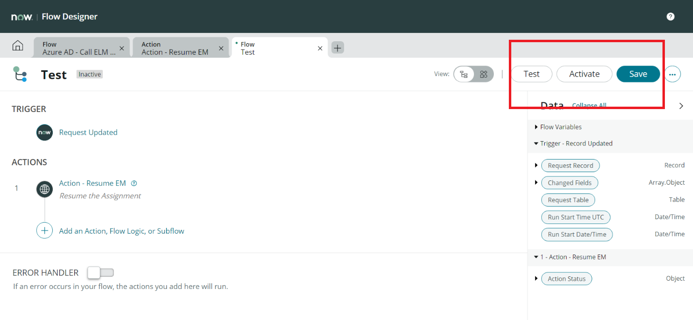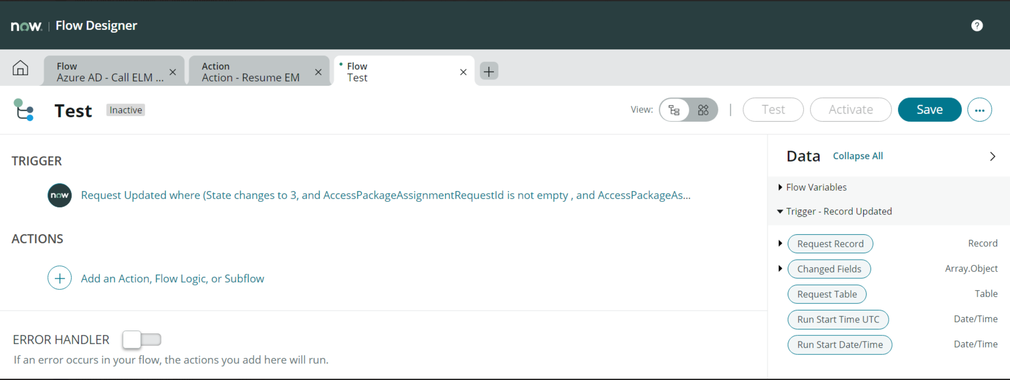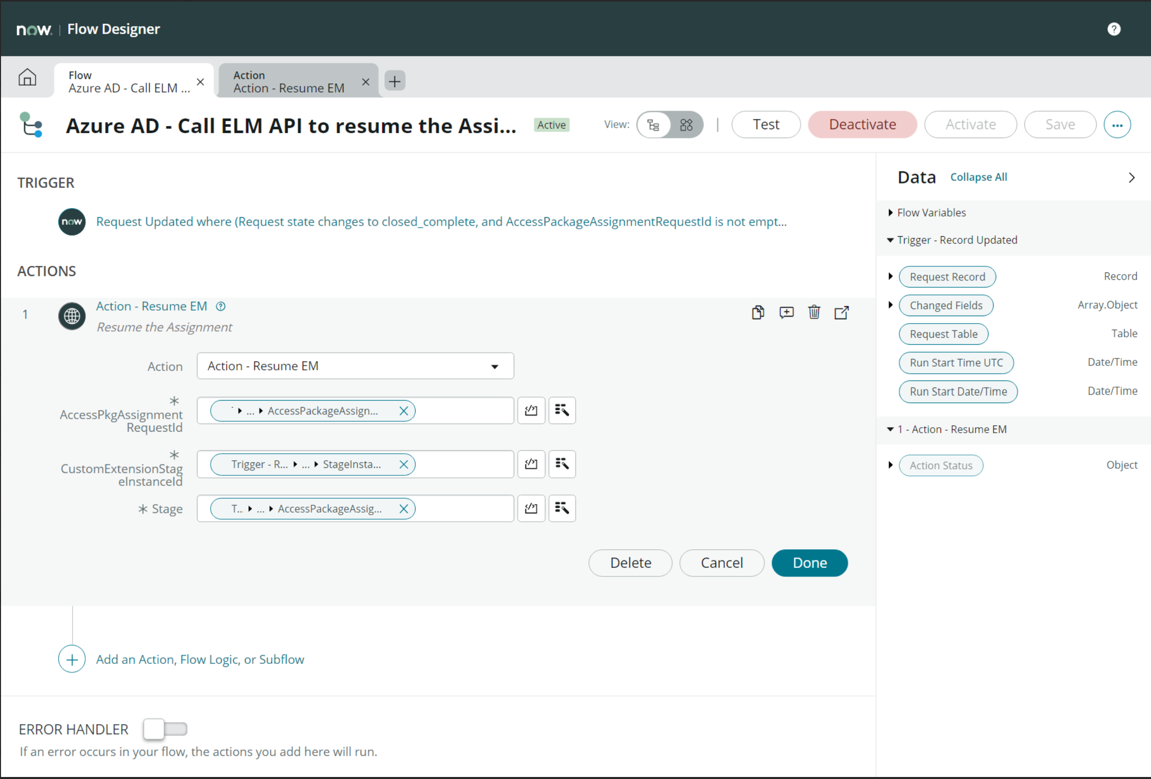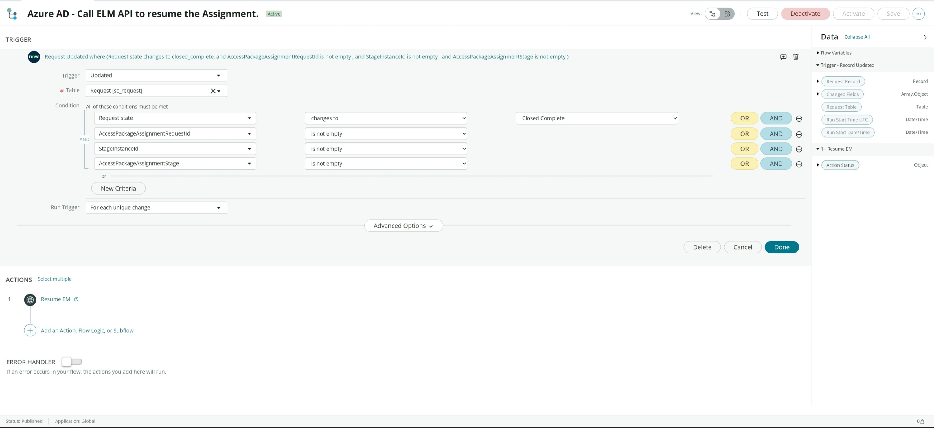 この時点で、ServiceNow チケットのクローズ後にエンタイトルメント管理ワークフローを再開するように ServiceNow を構成します。