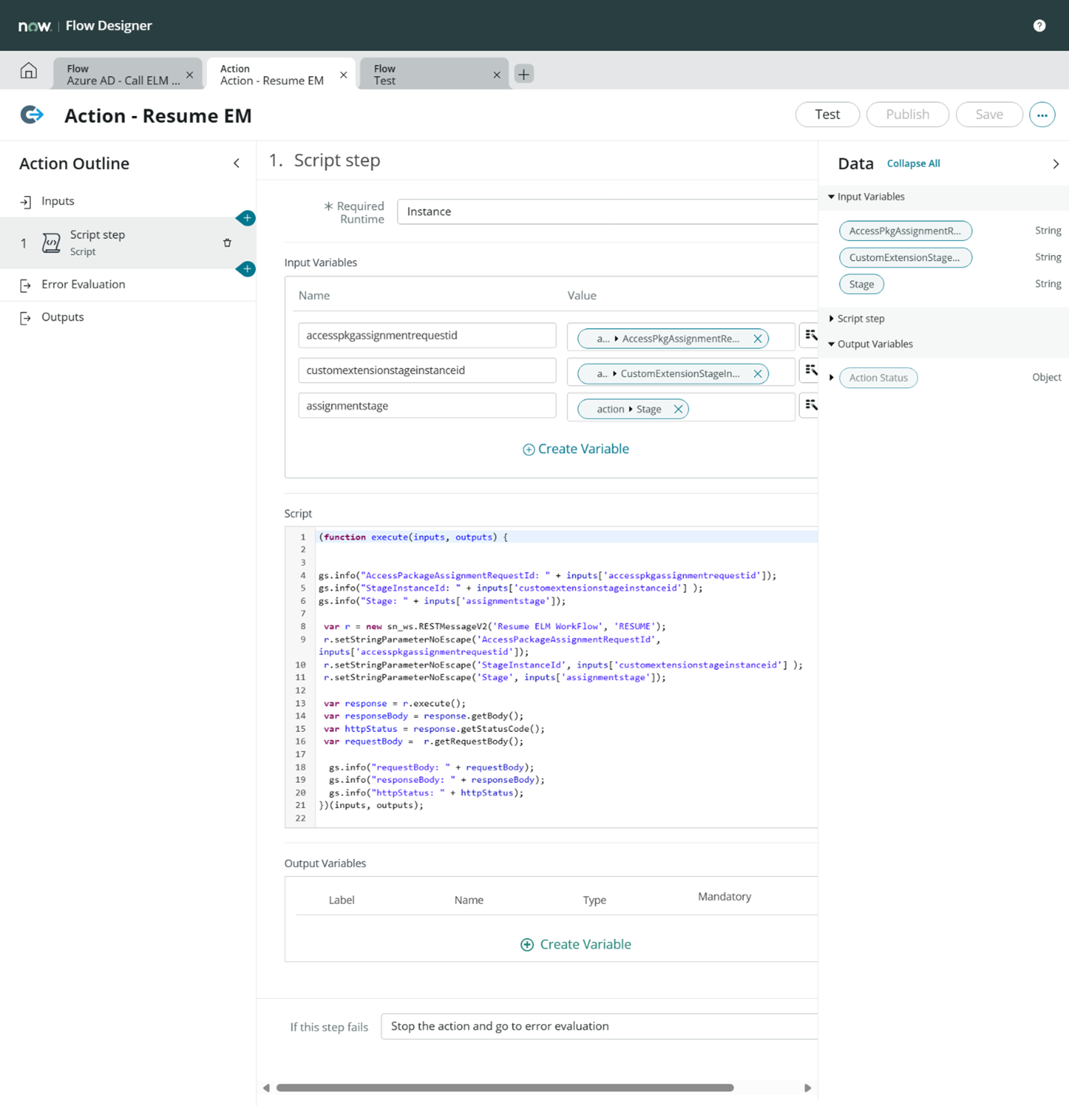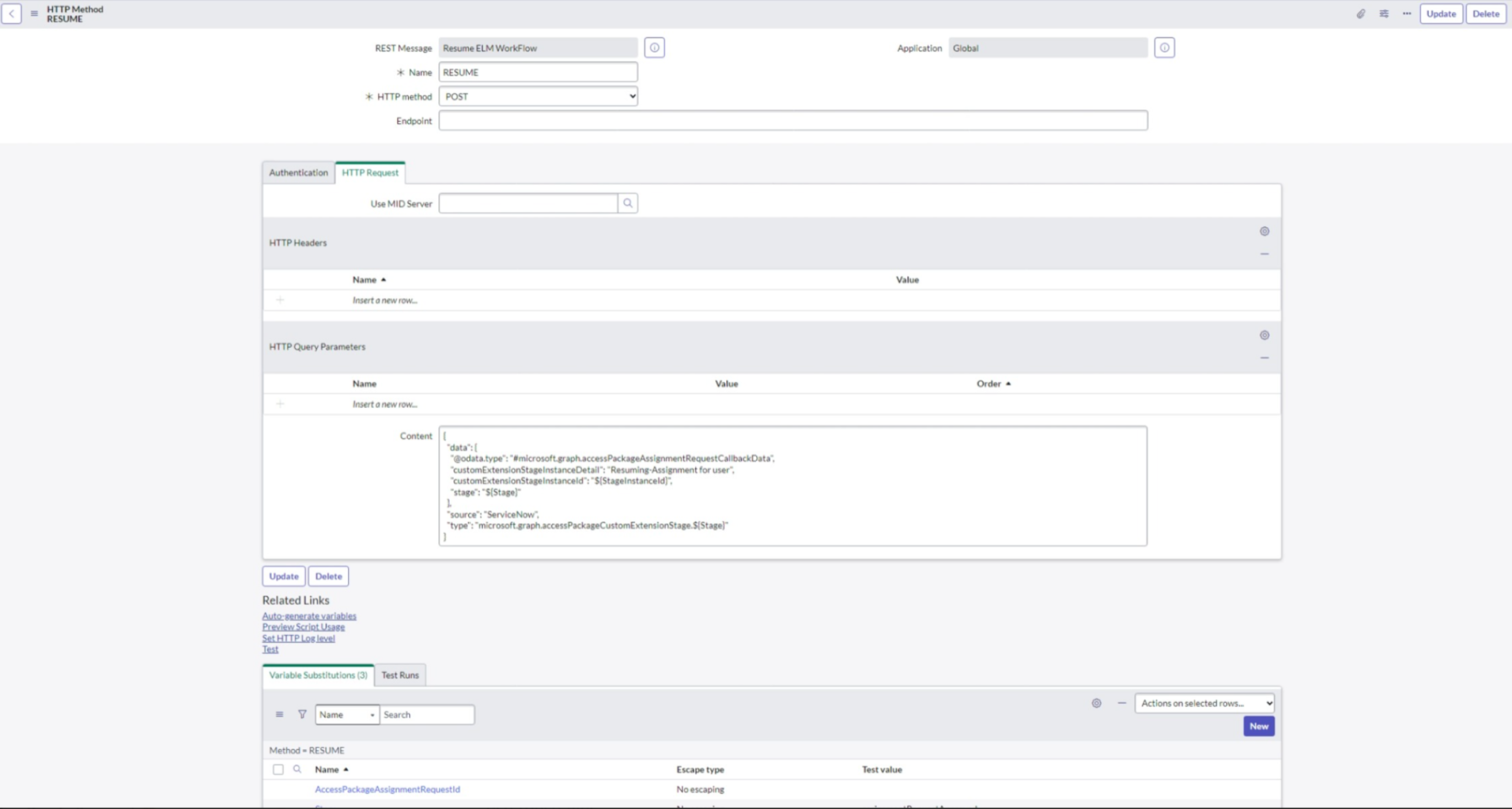 (function execute(inputs, outputs) { gs.info("AccessPackageAssignmentRequestId: " + inputs['accesspkgassignmentrequestid']); gs.info("StageInstanceId: " + inputs['customextensionstageinstanceid'] ); gs.info("Stage: " + inputs['assignmentstage']); var r = new sn_ws.RESTMessageV2('Resume ELM WorkFlow', 'RESUME'); r.setStringParameterNoEscape('AccessPackageAssignmentRequestId', inputs['accesspkgassignmentrequestid']); r.setStringParameterNoEscape('StageInstanceId', inputs['customextensionstageinstanceid'] ); r.setStringParameterNoEscape('Stage', inputs['assignmentstage']); var response = r.execute(); var responseBody = response.getBody(); var httpStatus = response.getStatusCode(); var requestBody = r.getRequestBody(); gs.info("requestBody: " + requestBody); gs.info("responseBody: " + responseBody); gs.info("httpStatus: " + httpStatus); })(inputs, outputs);