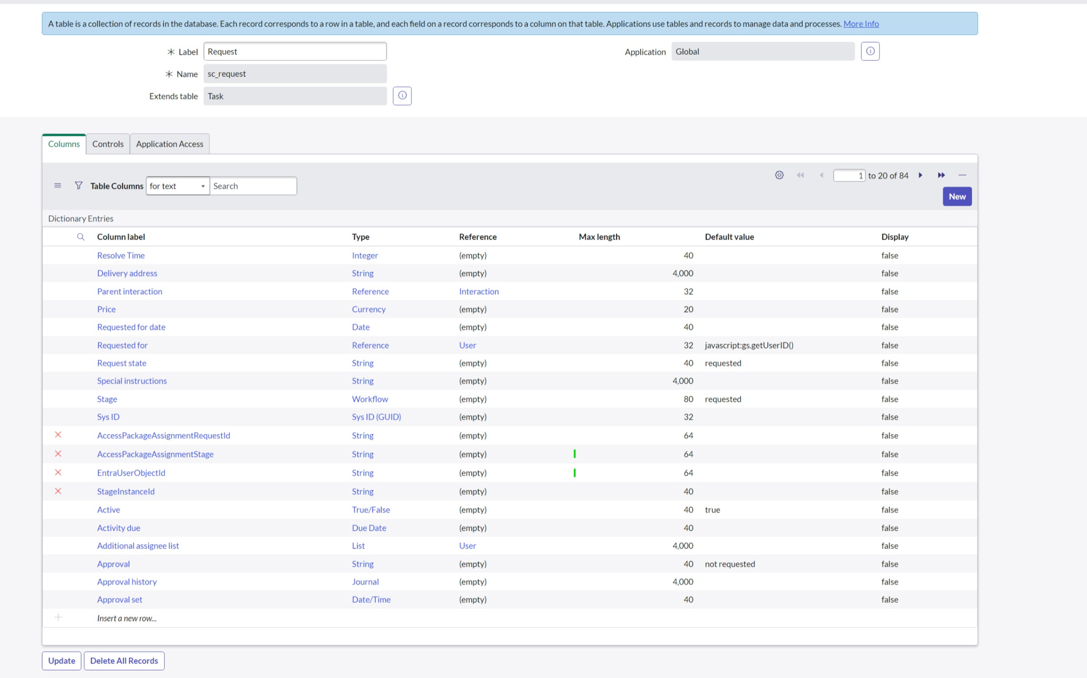 - 要求テーブル スキーマの変更: 要求テーブル スキーマを変更するには、次の図に示す 3 つのテーブルに変更を加えます。