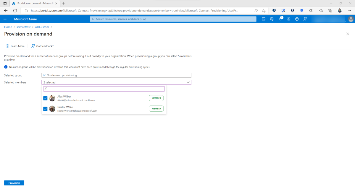 - グループのオンデマンド プロビジョニングでは、一度に最大 5 人のメンバーの更新がサポートされます。 テナント間同期や Workday などのコネクタでは、グループのプロビジョニングはサポートされていないため、結果としてグループのオンデマンド プロビジョニングはサポートされません。