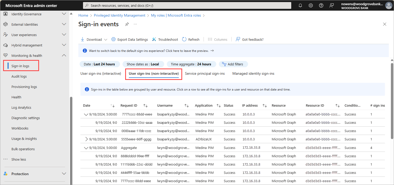 Microsoft Entra の監視と正常性には、テナントの正常性を監視するのに役立ついくつかの種類のサインイン ログが用意されています。 非対話型サインインは、Microsoft Entra 管理センターのユーザー サインイン ログのサブセットです。