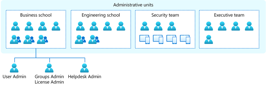 管理単位では、ロールのアクセス許可が、組織の任意の定義部分に限定されます。 たとえば、管理単位を使用して、ヘルプデスク管理者のロールを地域のサポート スペシャリストに委任できます。そうすれば、そのスペシャリストが自分のサポートするリージョンのユーザーのみを管理できます。 なお、管理単位のメンバーではないユーザーにロールを割り当てる場合、そのロールのスコープはテナント全体になります。